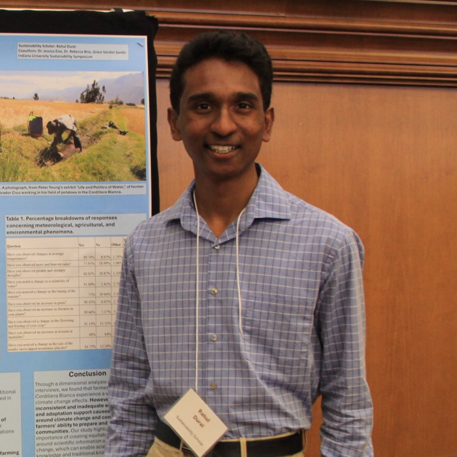 Rahul Durai is an undergraduate research assistant working on a citizen science platform for collecting and mapping irrigation data. He is pursuing a Bachelor of Arts in environmental and sustainability studies and English at Indiana University Bloomington. In addition to his work for Dr. Yaqian He, he works on social scientific projects about agriculture and public health through the Department of Environmental and Occupational Health. Outside of research, he enjoys running, walking his dog, and reading.